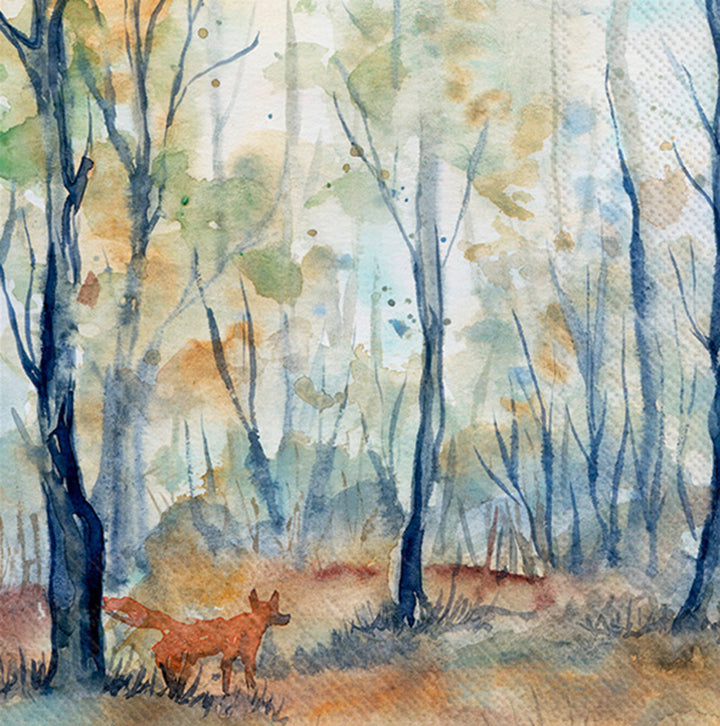 Washed in warm amber hues, these paper cocktail napkins capture a tranquil woodland scene with watercolor trees and a watchful fox. Sized for sips and small bites, Amber Woods brings artful charm to everyday entertaining and casual gatherings. Approximate dimensions are 5 x 5 x 1 inches. German printed on soft, 3-ply paper.