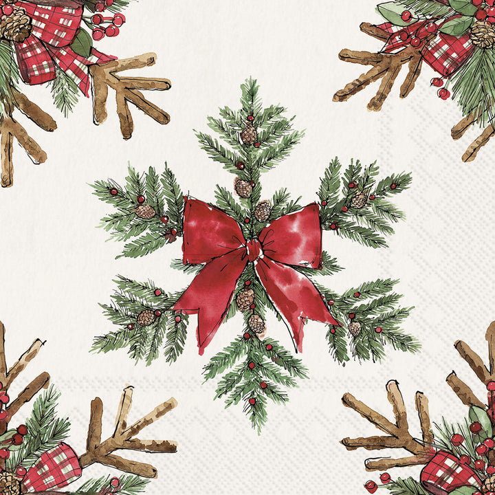 Snowflake-style stars fashioned from painterly greenery, berries, and pinecones pop against a light grey ground, each finished with a classic red bow. Crafted in soft, absorbent paper, these cocktail napkins lend a polished accent to drinks and nibbles for effortless entertaining. Approximate dimensions are 5 x 5 x 1 inches. German printed on soft, 3-ply paper.