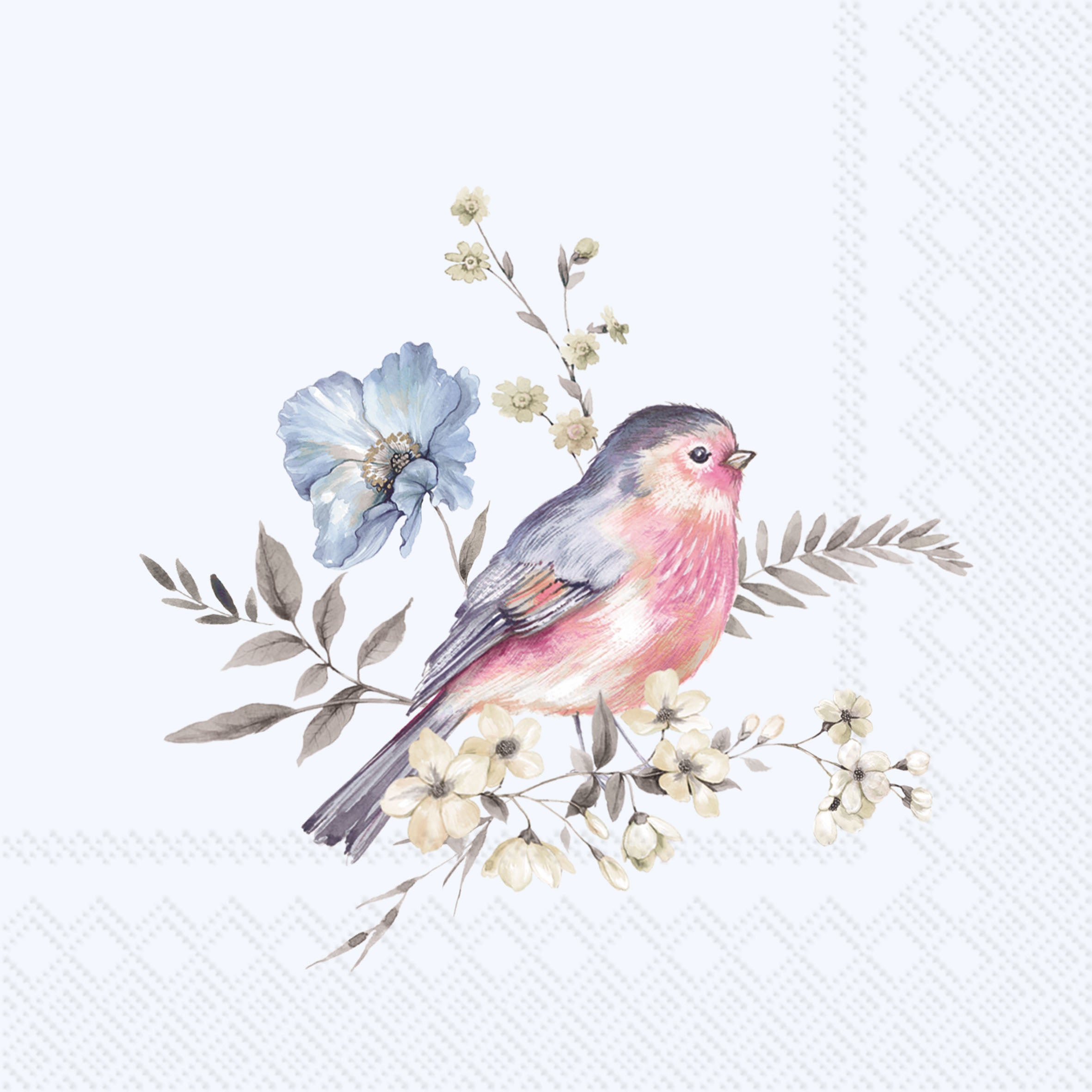 Perched amid watercolor blossoms on a light blue ground, the Softly Faded Birds light blue Cocktail Napkin brings a serene, painterly charm to any bar cart or canapé service. Made of soft, absorbent paper, these cocktail napkins elevate everyday gatherings with a gentle touch of nature. German printed on soft, 3-ply paper. Approximate dimensions are 5 x 5 x 1 inches.