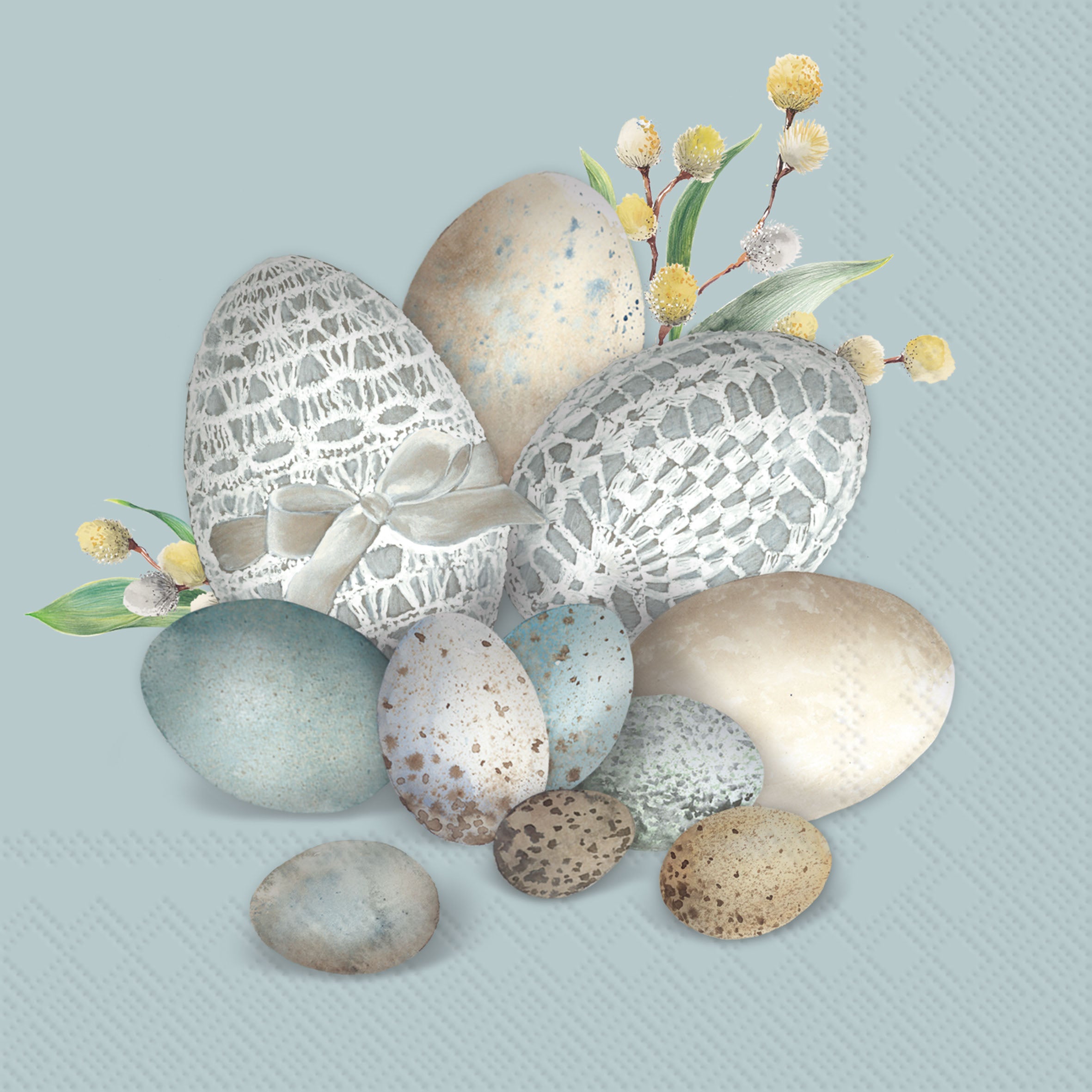 With a tranquil turquoise palette and painterly eggs wrapped in lace-like detail, the Eggs Turquoise Cocktail Napkin brings understated charm to any tray or tabletop. Printed on soft, sturdy paper, these cocktail napkins lend a refined, nature-inspired touch to everyday sips and bites. Approximate dimensions are 5 x 5 x 1 inches. German printed on soft, 3-ply paper.