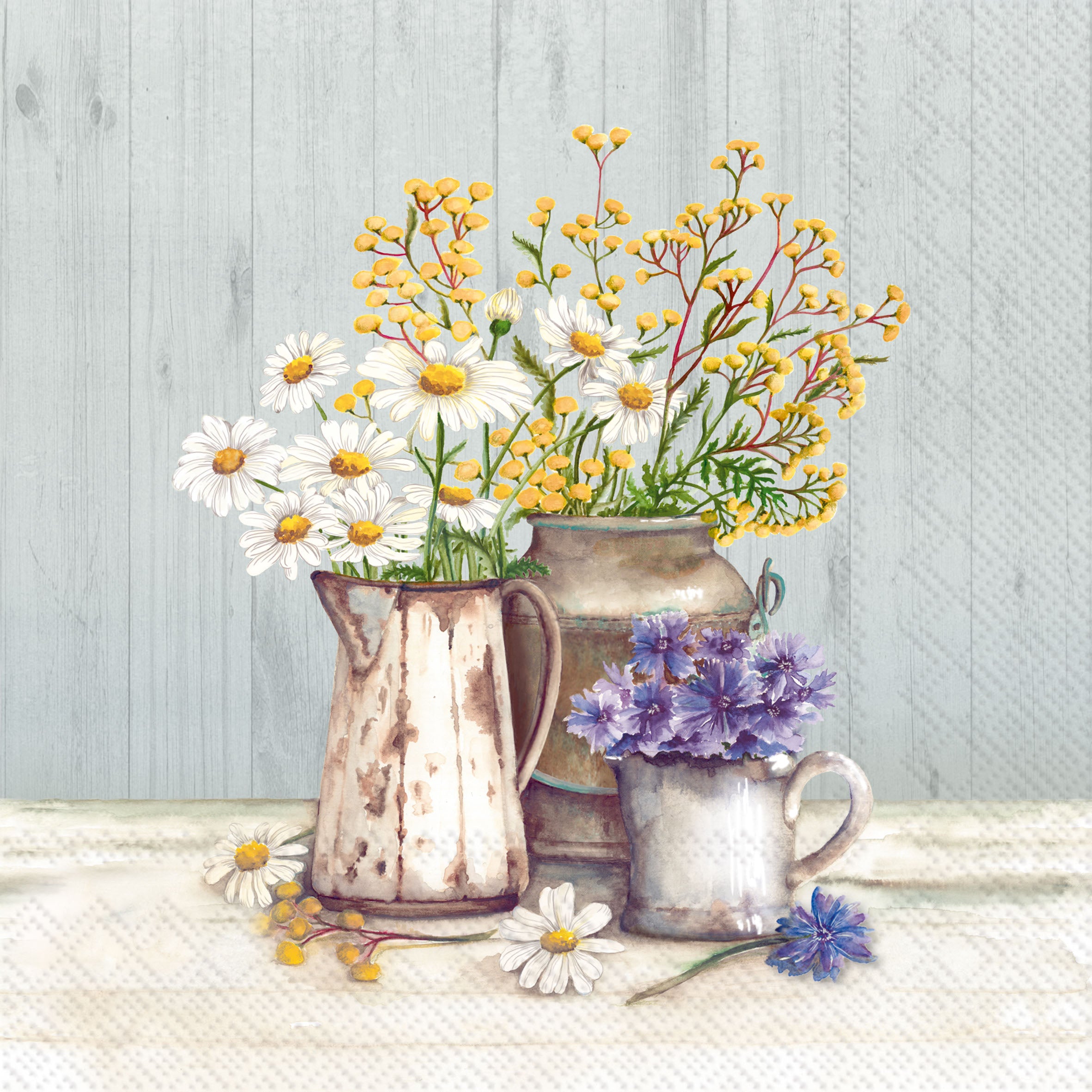 Bring farmhouse charm to the cocktail hour with these paper cocktail napkins, artfully printed with a rustic still life of wildflowers in weathered pitchers. Perfectly sized for drinks and small bites, the Country Still Life Cocktail Napkin lends an inviting floral accent to everyday entertaining and casual gatherings. Approximate dimensions are 5 x 5 x 1 inches. German printed on soft, 3-ply paper.