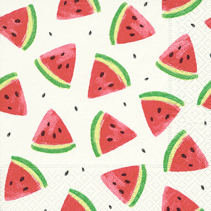 Splashed with bold pink-and-green watermelon wedges and playful seeds, these cocktail napkins bring a juicy pop of color to every sip. Made of soft, absorbent paper yet sturdy enough for small bites and happy-hour drips, they effortlessly brighten the bar cart and everyday get-togethers. Approximate dimensions are 5 x 5 x 1 inches. German printed on soft, 3-ply paper.
