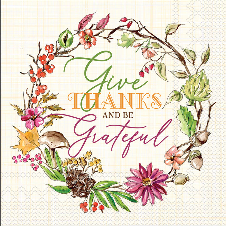Invite warm conversation with these paper cocktail napkins, featuring a watercolor wreath of botanicals encircling the uplifting message “Give Thanks and Be Grateful.” Soft yet sturdy for drinks and small bites, they add a thoughtful touch to gatherings, happy hours, and everyday moments of appreciation. Approximate dimensions are 5 x 5 x 1 inches. German printed on soft, 3-ply paper.