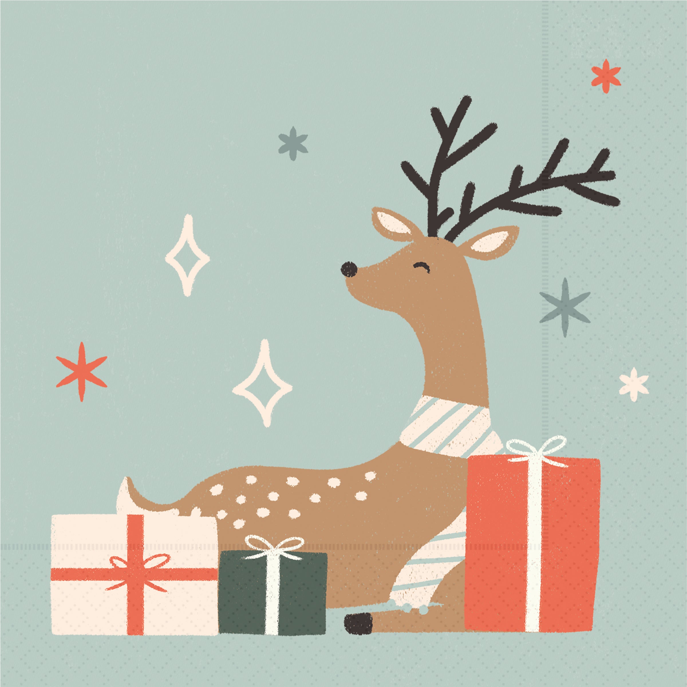 Featuring a scarf-clad deer nestled among wrapped presents, Dancing Deer Presents Cocktail Napkins lend a playful, festive note to bar carts and canapé trays alike. Crafted from soft, absorbent paper, these cocktail napkins keep spills in check while adding charming animal-motif flair to any gathering. Approximate dimensions are 5 x 5 x 1 inches. German printed on soft, 3-ply paper.