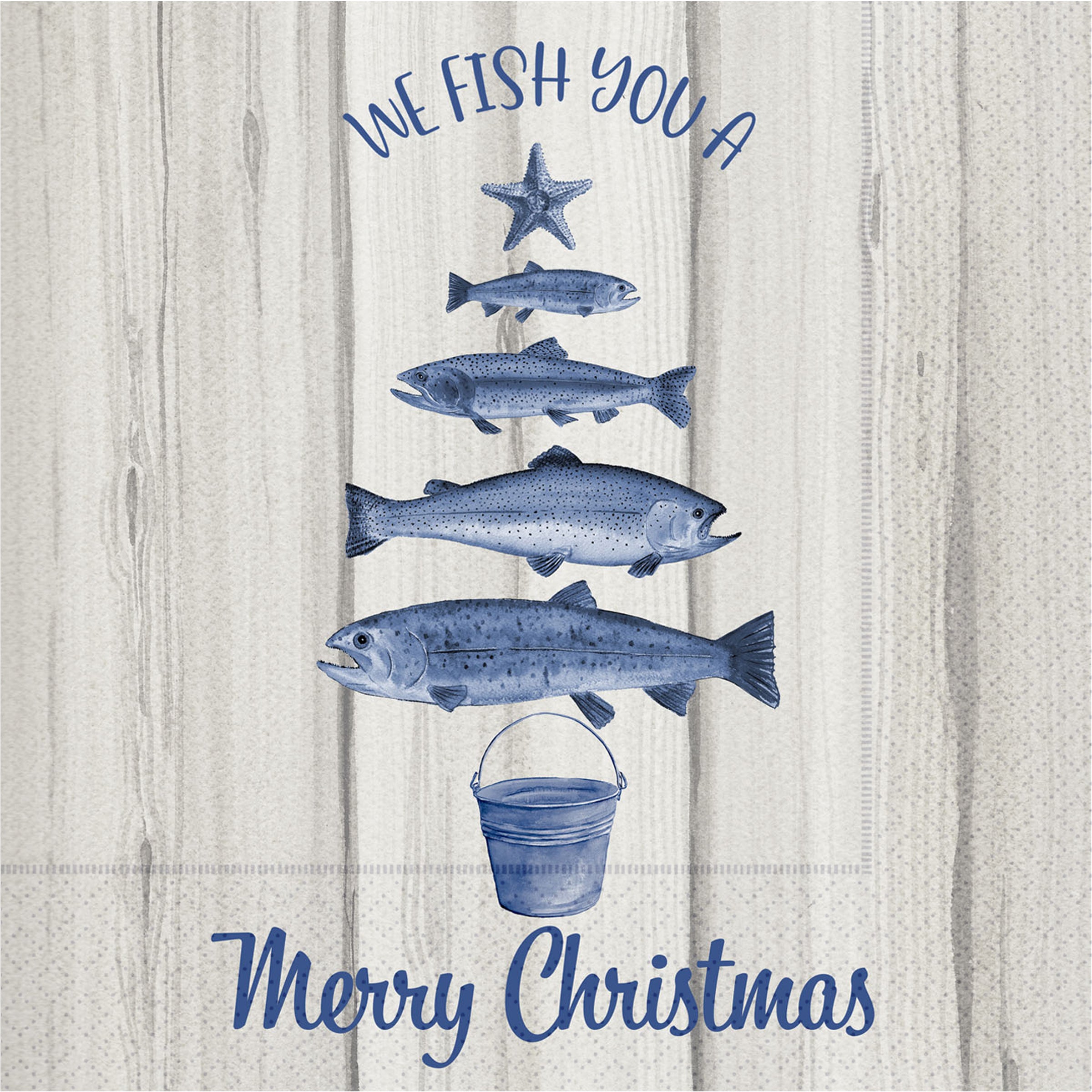 Cast a little whimsy into holiday happy hour with these paper cocktail napkins, starring a blue fish “tree” and the cheeky greeting, “We fish you a Merry Christmas.” Soft and absorbent for hors d’oeuvres and cocktails, they reel in easy lakeside charm for festive gatherings from cabin parties to coastal celebrations. Approximate dimensions are 5 x 5 x 1 inches. German printed on soft, 3-ply paper.