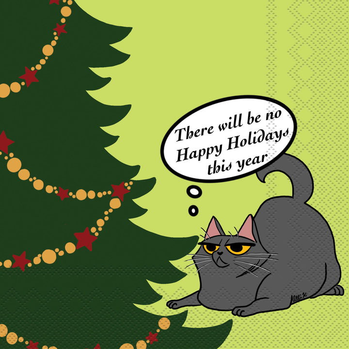 Bring cheeky cheer to the bar with these paper cocktail napkins, starring a delightfully grumpy cat lounging by a trimmed tree and delivering pitch-perfect holiday snark. Soft yet sturdy, they keep cocktails tidy and conversations lively, making them a mischievous must-have for pet-loving hosts. Approximate dimensions are 5 x 5 x 1 inches. German printed on soft, 3-ply paper.