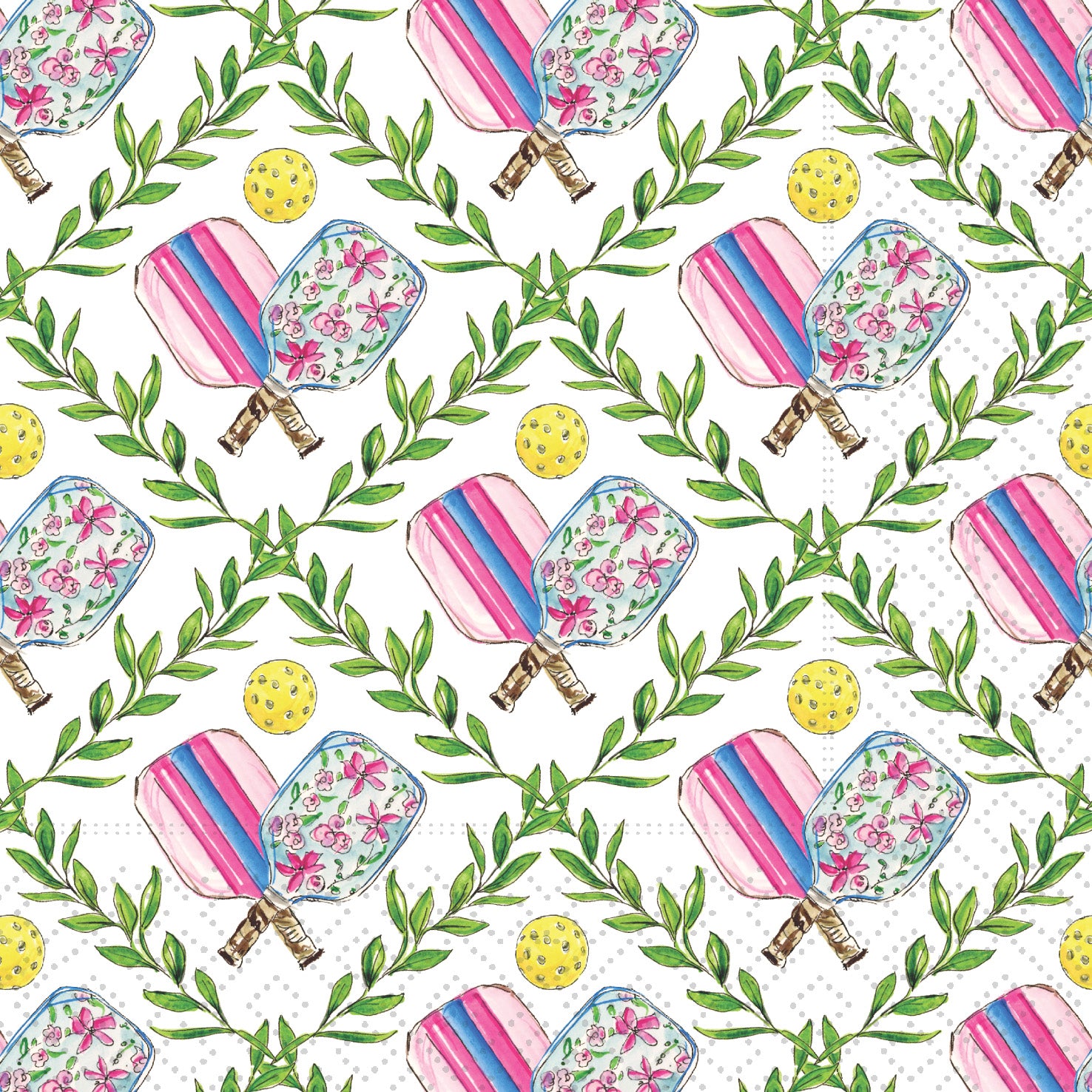 Serve winning style with our Pickleball Game Cocktail Napkin, featuring watercolor paddles, bright balls, and leafy greens in a lively allover print. Made of paper, this sporty accent brings courtside charm to happy hours, patio sips, and playful gatherings. Approximate dimensions are 5 x 5 x 1 inches. German printed on soft, 3-ply paper.