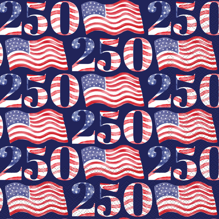 Raise a glass to USA 250 with these patriotic cocktail napkins, featuring painterly American flags and bold “250” numerals against a rich navy backdrop. Made of soft, absorbent paper, they bring a spirited finish to bar carts, buffets, and every celebratory toast. German printed on soft, 3-ply paper. Approximate dimensions are 5 x 5 x 1 inches.