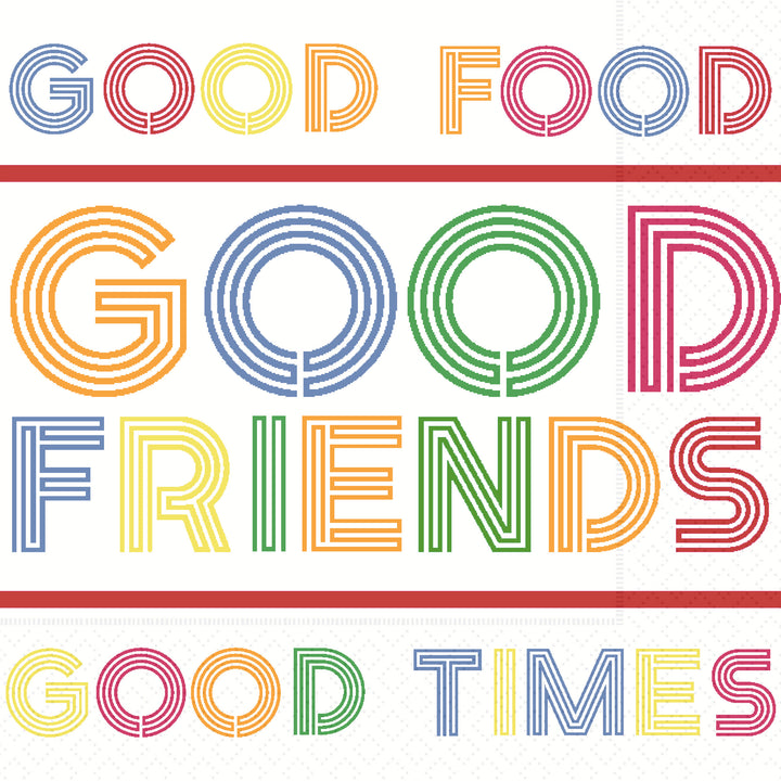 Celebrate connection with our Good Friends Cocktail Napkin, featuring playful multicolor linework that spells out “Good Food, Good Friends, Good Times” in bold, party-ready type. Made from soft, absorbent paper, these sentiment-forward cocktail napkins bring a pop of color and effortless cleanup to appetizers, bar carts, and every clink-worthy moment. German printed on soft, 3-ply paper. Approximate dimensions are 5 x 5 x 1 inches.