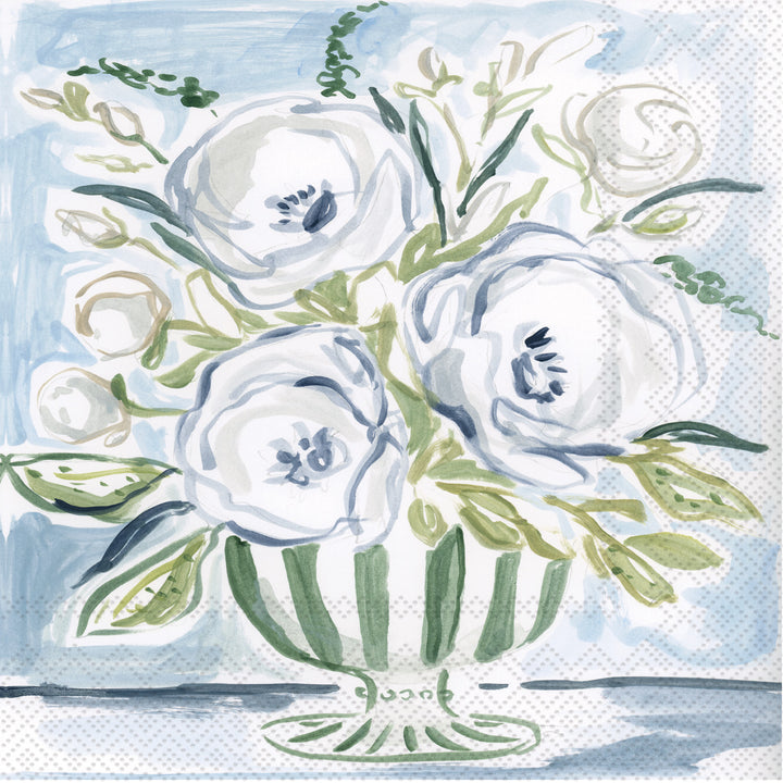 Painterly blooms in cool blue and fresh green bring artful charm to every sip on our Floral Vase Cocktail Napkin. Printed on soft, absorbent paper, these cocktail-size napkins elevate casual pours and polished parties alike. German printed on soft, 3-ply paper. Approximate dimensions are 5 x 5 x 1 inches.