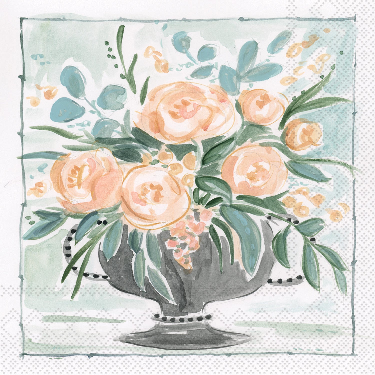 The Winnie Cocktail Napkin showcases a painterly bouquet—soft blush blooms and lush greenery gathered in a classic urn—bringing refined charm to any setting. Printed on quality paper, these absorbent cocktail napkins add a fresh floral flourish to happy hours, appetizers, and dessert spreads. German printed on soft, 3-ply paper. Approximate dimensions are 5 x 5 x 1 inches.