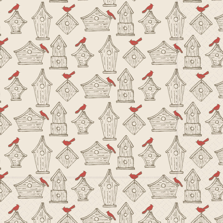 Sketchy birdhouses and bright red cardinals bring cheerful, rustic charm to these cocktail napkins, adding a pop of color to any spread. Made from soft, absorbent paper, they perch polished style beside appetizers, drinks, and desserts. German printed on soft, 3-ply paper. Approximate dimensions are 5 x 5 x 1 inches.