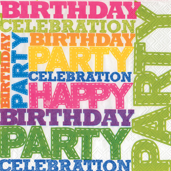 Big, confetti-bright lettering splashes HAPPY, PARTY, and CELEBRATION across these paper cocktail napkins for instant festive energy. Durable and absorbent with a soft feel, they keep glasses tidy and dessert moments neat while layering bold birthday style onto any bar cart or buffet. Approximate dimensions are 5 x 1 x 5 inches. German printed on soft, 3-ply paper.