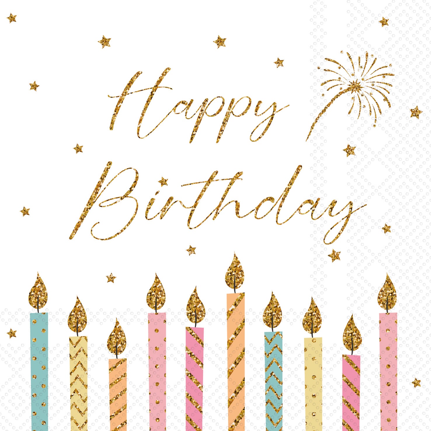 Pastel candles and sparkling gold script declare “Happy Birthday” on the Happy Candles Cocktail Napkin, creating an instant party mood with starry shine. Printed on quality paper, this lively cocktail napkin brings polished cheer to drinks and desserts while keeping every celebration neat. Approximate dimensions are 5 x 5 x 1 inches. German printed on soft, 3-ply paper.