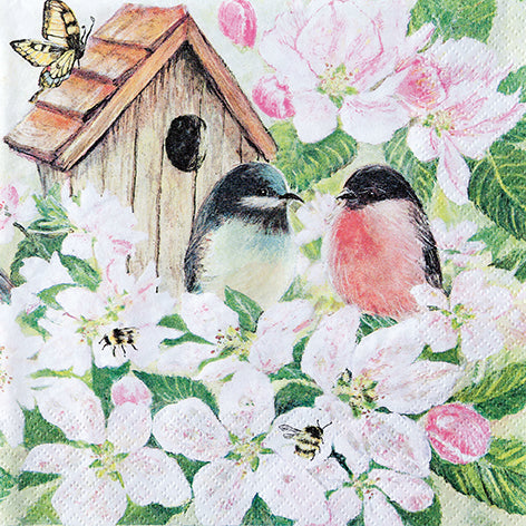 Charm guests with a vignette of two songbirds gathered by a cozy birdhouse amid lush blossoms, butterflies, and bees, richly detailed on soft, absorbent paper. These cocktail napkins elevate casual sips and bites with artful color and reliable strength, perfect for everyday entertaining and impromptu get-togethers. Approximate dimensions are 5 x 5 x 1 inches. German printed on soft, 3-ply paper.