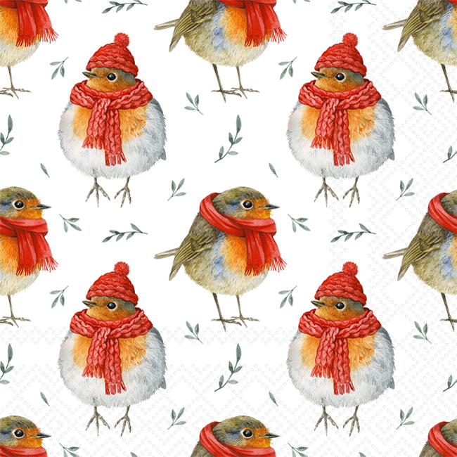 Plump robins bundled in bright red scarves and caps dance across these paper cocktail napkins, bringing instant winter cheer to the table. Printed on quality paper, they add a charming seasonal accent to everything from cozy cocoa breaks to celebratory toasts. Approximate dimensions are 5 x 5 x 1 inches. German printed on soft, 3-ply paper.