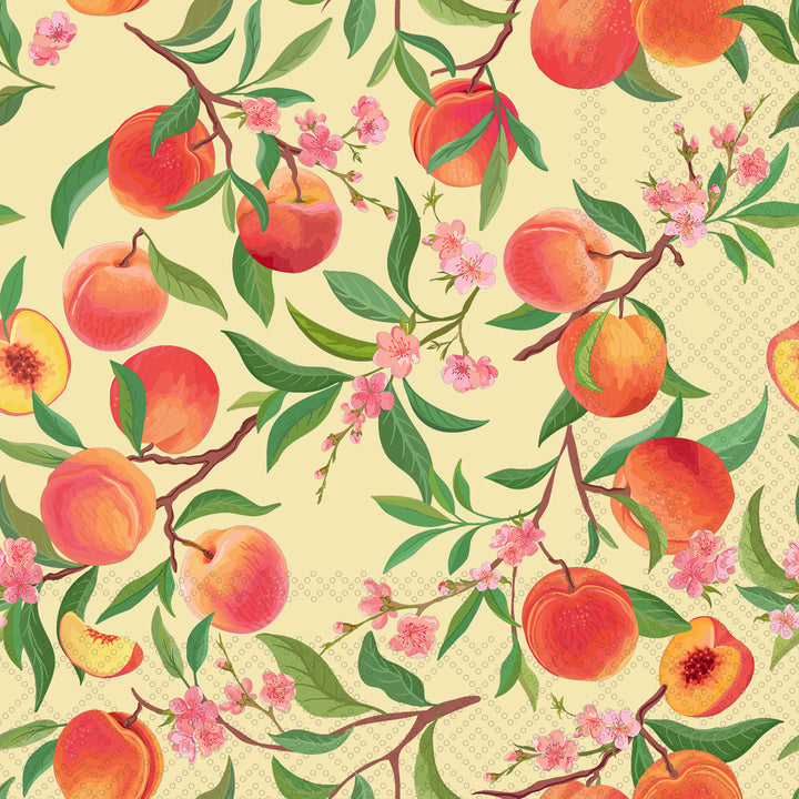 Ripe peaches and delicate blossoms cascade across these cocktail napkins, lending fresh orchard charm to sips and small plates. Made of soft, absorbent paper in an easy entertaining size, the Peach Lover Cocktail Napkin keeps every toast tidy while adding a juicy pop of color. Approximate dimensions are 5 x 5 x 1 inches. German printed on soft, 3-ply paper.