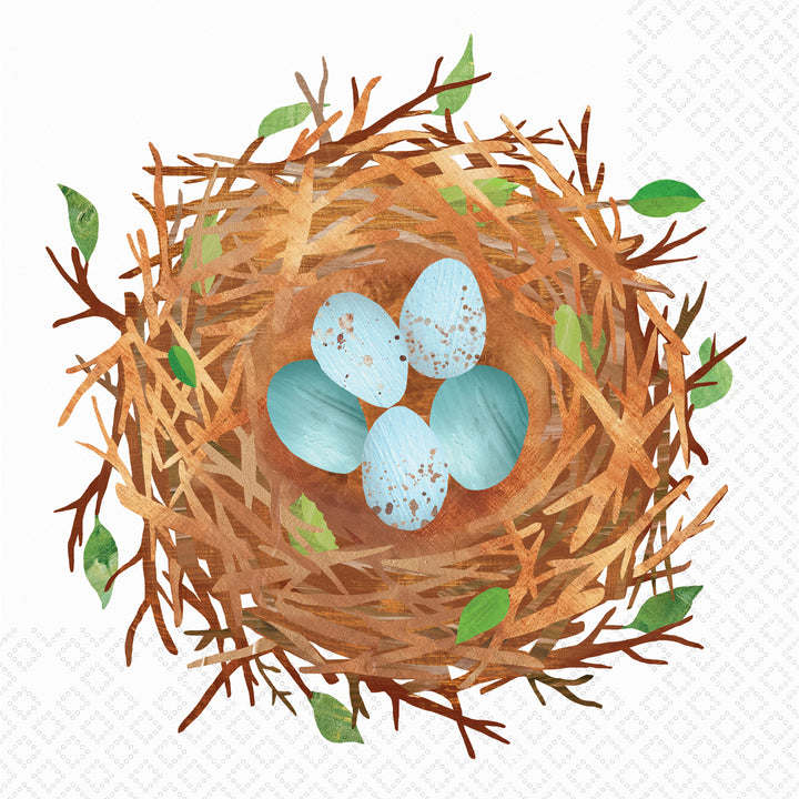 An artful illustration of a twig nest cradling speckled blue eggs brings organic charm to every pour and plate. Printed on quality paper, these cocktail napkins deliver effortless cleanup while lending a serene, nature-inspired accent to the table. Approximate dimensions are 5 x 5 x 1 inches. German printed on soft, 3-ply paper.