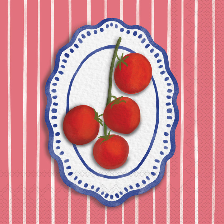 Infused with Mediterranean kitchen charm, the Amalfi Cucina Tomatoes Cocktail Napkin showcases vine-on tomatoes atop a scalloped plate motif against playful stripes, all printed on crisp paper. Perfect beside cocktails and small bites, this fresh pattern brightens any gathering with easy everyday style. German printed on soft, 3-ply paper. Approximate dimensions are 5 x 5 x 1 inches.