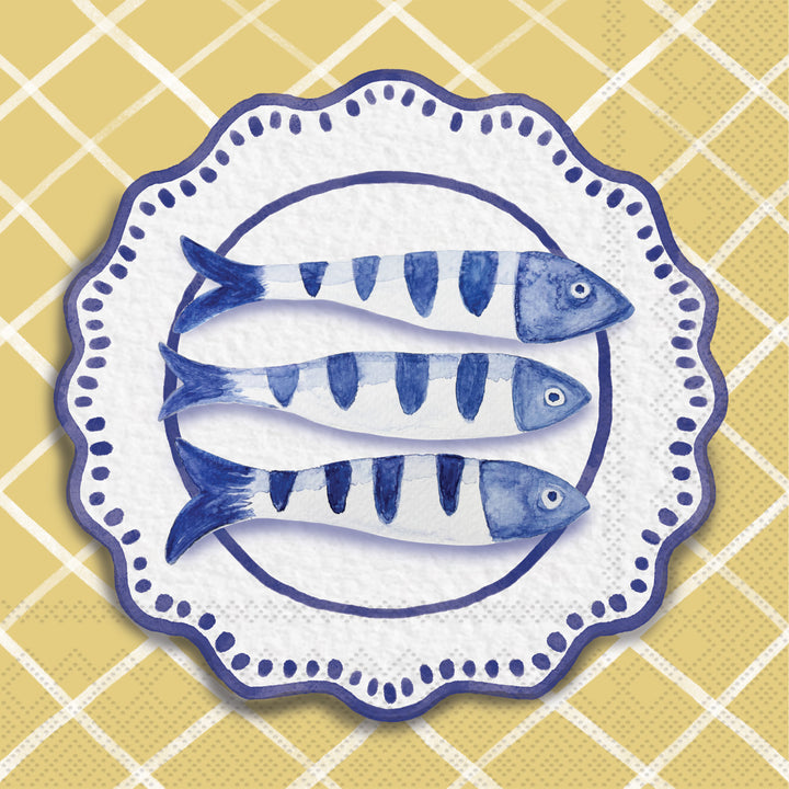 Amalfi Cucina Fish Cocktail Napkin channels seaside kitchen charm with watercolor sardines in crisp indigo on a scalloped plate motif. Crafted in paper, this lively coastal pattern brightens every pour and snack spread with effortless, everyday style. German printed on soft, 3-ply paper. Approximate dimensions are 5 x 5 x 1 inches.