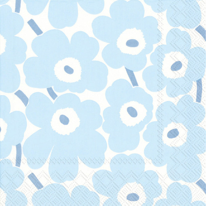Set a fresh tone at the bar with the Mini Unikot Cocktail Napkin Light Blue, where stylized poppy blooms dance across soft white paper for a clean, modern look. Absorbent and party-ready, these paper cocktail napkins bring effortless floral charm to cocktails, canapés, and everyday gatherings. Approximate dimensions are 5 x 5 x 1 inches. German printed on soft, 3-ply paper.