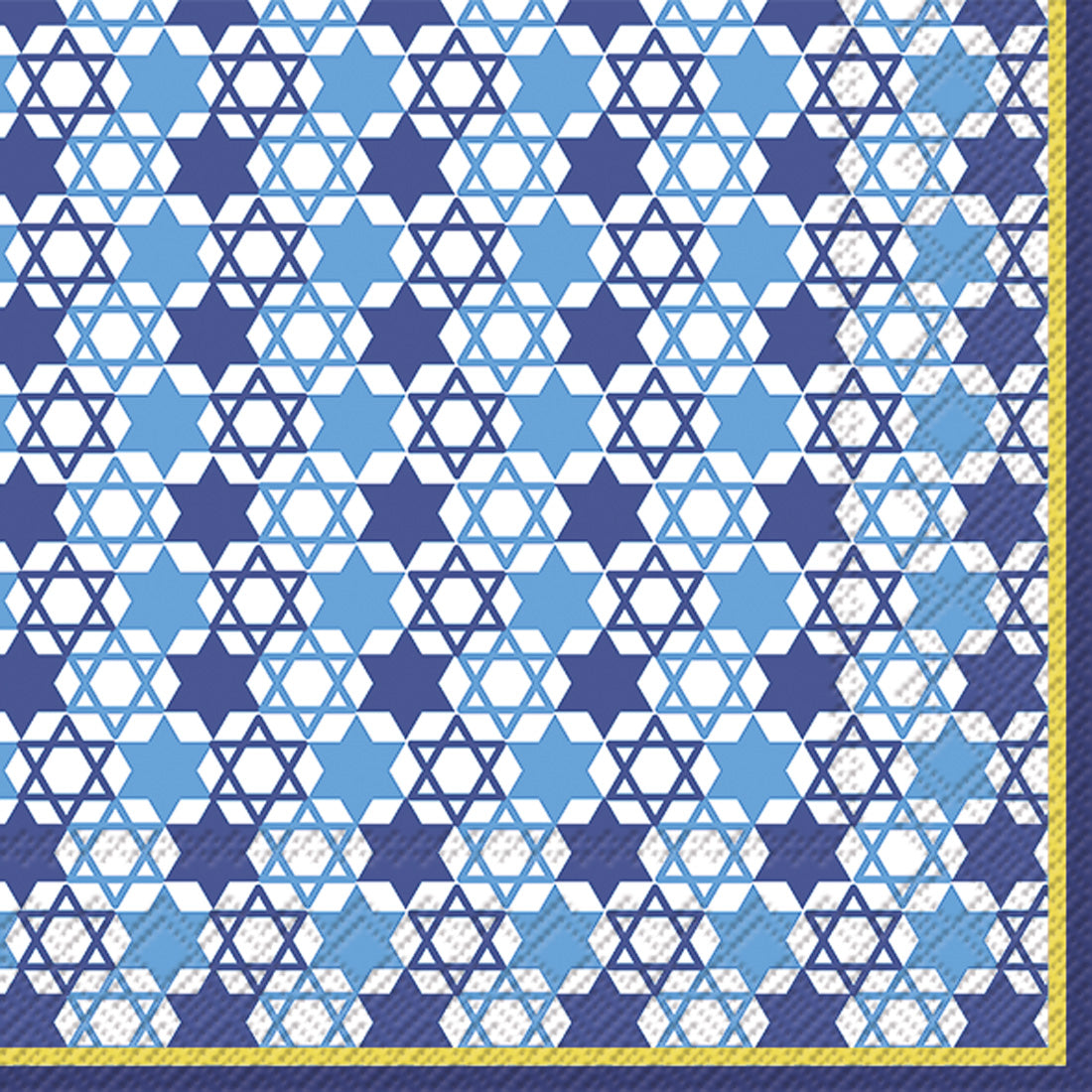 Illuminate your table with the Festival of Lights Cocktail Napkin Blue, crafted from soft yet sturdy paper and patterned with layered blue Stars of David framed by a golden trim. Ideal for cocktails and small bites, these disposable napkins add polished, meaningful style to gatherings while making cleanup effortless. Approximate dimensions are 5 x 1 x 5 inches. German printed on soft, 3-ply paper.