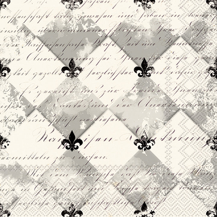Elevate the bar with these paper cocktail napkins, showcasing a classic fleur-de-lis scattered across cream and dove-gray argyle with elegant script accents. Refined yet effortless, they lend Parisian polish to every pour and appetizer. Approximate dimensions are 5 x 1 x 5 inches. German printed on soft, 3-ply paper.