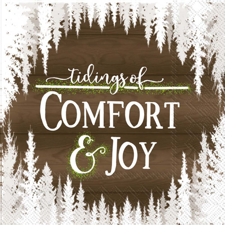 Elevate every toast with these paper cocktail napkins, showcasing a woodgrain backdrop and the uplifting sentiment “Comfort & Joy” accented in fresh green. Soft yet absorbent and perfectly sized for drinks and small bites, they bring a polished, feel-good touch to any gathering. Approximate dimensions are 5 x 1 x 5 inches. German printed on soft, 3-ply paper.