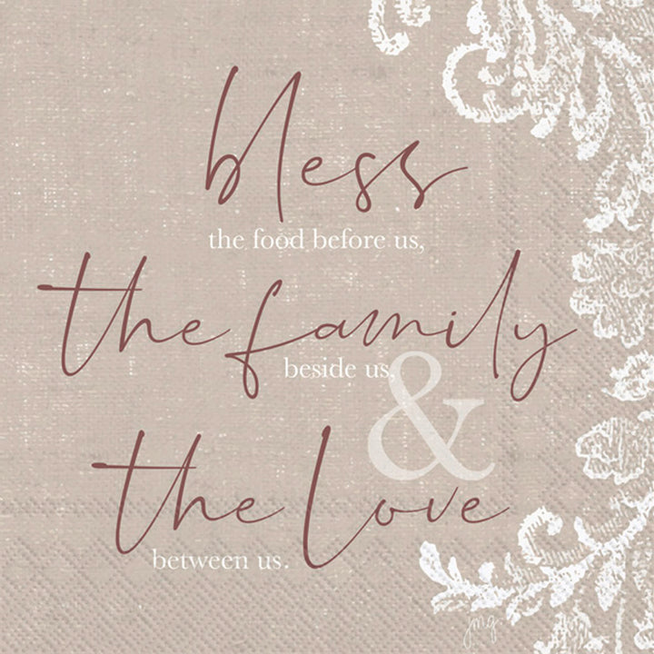 Set a warm, welcoming tone with the Bless The Food Cocktail Napkin, featuring an elegant script that reads “Bless the food before us, the family beside us, & the love between us” on a soft neutral backdrop. Crafted from premium paper, these absorbent cocktail napkins bring heartfelt sentiment to hors d’oeuvres, drinks, and every gathering. Approximate dimensions are 5 x 1 x 5 inches. German printed on soft, 3-ply paper.
