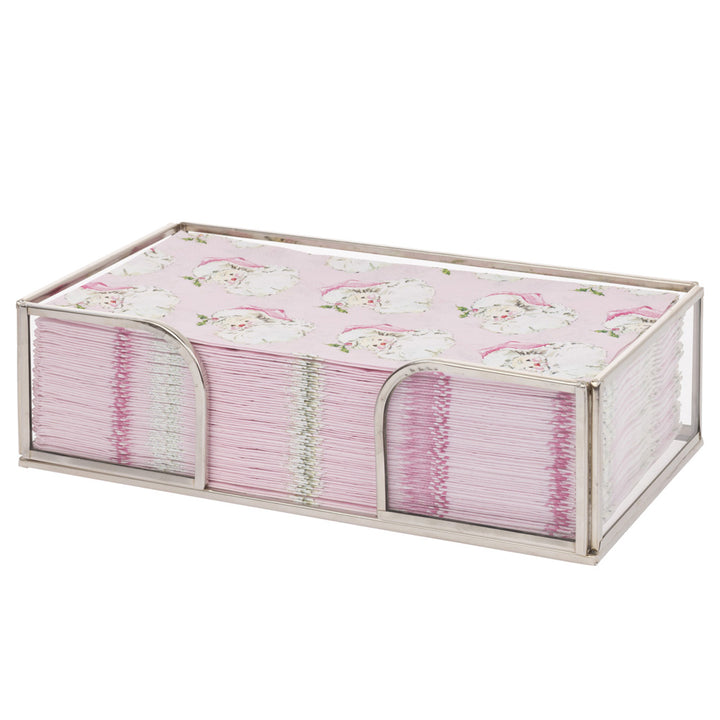 The Silver Edge Glass Guest Caddy pairs clear glass panels with a sleek metal frame to neatly corral and showcase guest towels or napkins. Its low-profile, silver-trimmed silhouette brings a refined, modern touch to a vanity, powder room, or buffet while keeping essentials within easy reach. Approximate dimensions are 8.5 x 4.5 x 2.25 inches.