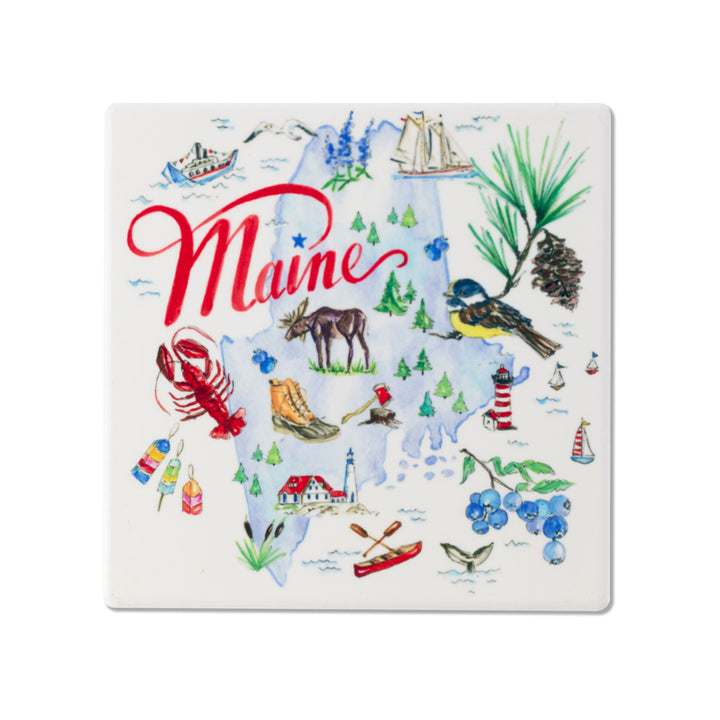 Celebrate the Pine Tree State at every sip with this ceramic-and-cork coaster featuring a cheerful watercolor map of Maine—complete with lobsters, lighthouses, moose, and wild blueberries. A smooth ceramic surface shows off the art while the natural cork backing protects tables and keeps drinks steady. Approximate dimensions are 4 x 4 x .25 inches.