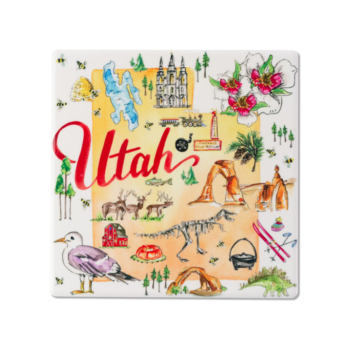 Bring a pop of state pride to the table with this Utah State Coaster, its glossy ceramic top splashed with whimsical art celebrating red-rock arches, mountain peaks, and native flora and fauna. A natural cork backing keeps it from sliding and protects surfaces from scratches, delivering everyday function with gift-worthy charm. Approximate dimensions are 4 x 4 x .25 inches.