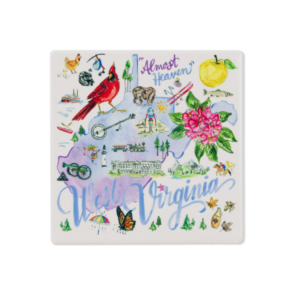 Celebrate the Mountain State with this ceramic-and-cork coaster, featuring a vibrant watercolor collage of West Virginia icons and a hand-lettered state name. A glossy, wipe-clean ceramic surface manages drips while the cork backing prevents slips and scratches—perfect solo or paired with the full state series. Approximate dimensions are 4 x 4 x .25 inches.