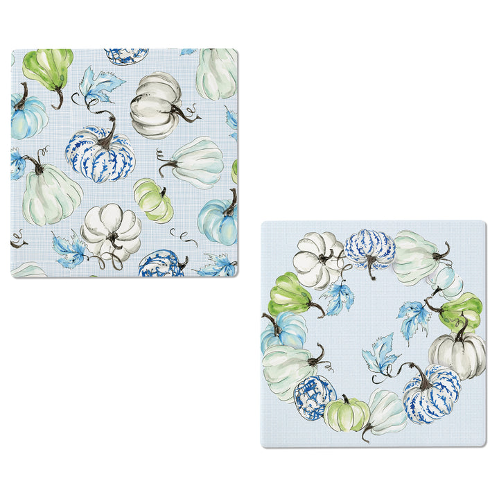 Chinoiserie Stacked Pumpkins Coasters showcase painterly pumpkins in soft blues, greens, and ivory with delicate chinoiserie flourishes for an artful touch at the table. Crafted of ceramic, they provide sturdy protection from hot mugs and icy glasses while lending chic style to coffee tables, bars, and buffets. Approximate dimensions are 4 x 4 x .25 inches.