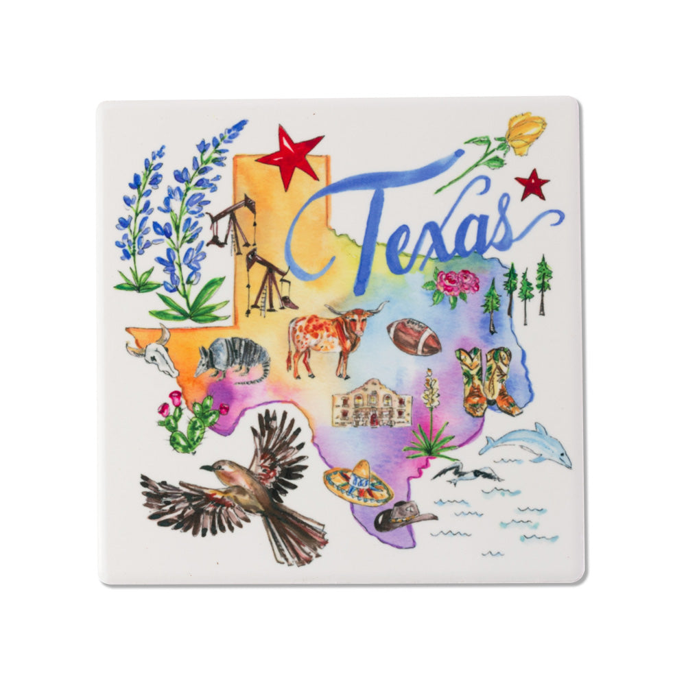 Celebrate the Lone Star State with a vibrant ceramic coaster showcasing a hand-painted style collage of Texas icons, from bluebonnets and longhorns to boots and oil rigs. A natural cork backing protects surfaces and resists slips, while the smooth ceramic top brings a polished, giftable touch to everyday entertaining. Approximate dimensions are 4 x 4 x .25 inches.