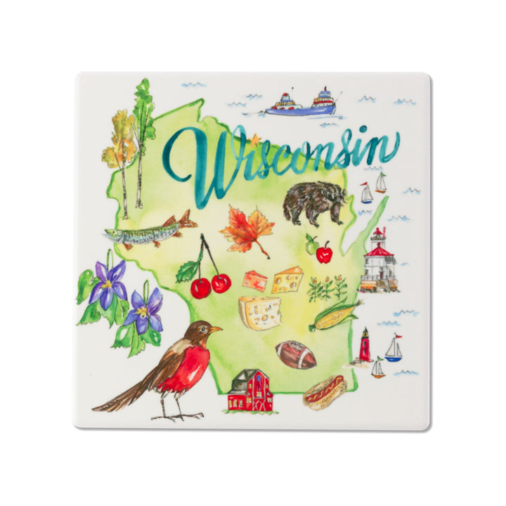 Celebrate local pride with the Wisconsin State Coaster, featuring a charming watercolor map and icons from lighthouses to cherries and cheese. A smooth ceramic surface paired with a skid-resistant cork backing protects tabletops while adding a cheerful pop of state-inspired style to everyday sips. Approximate dimensions are 4 x 4 x .25 inches.