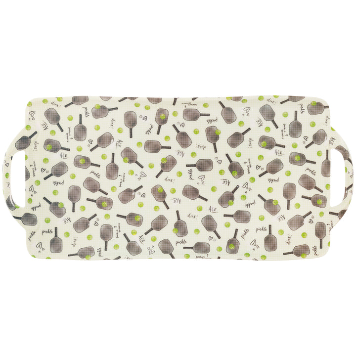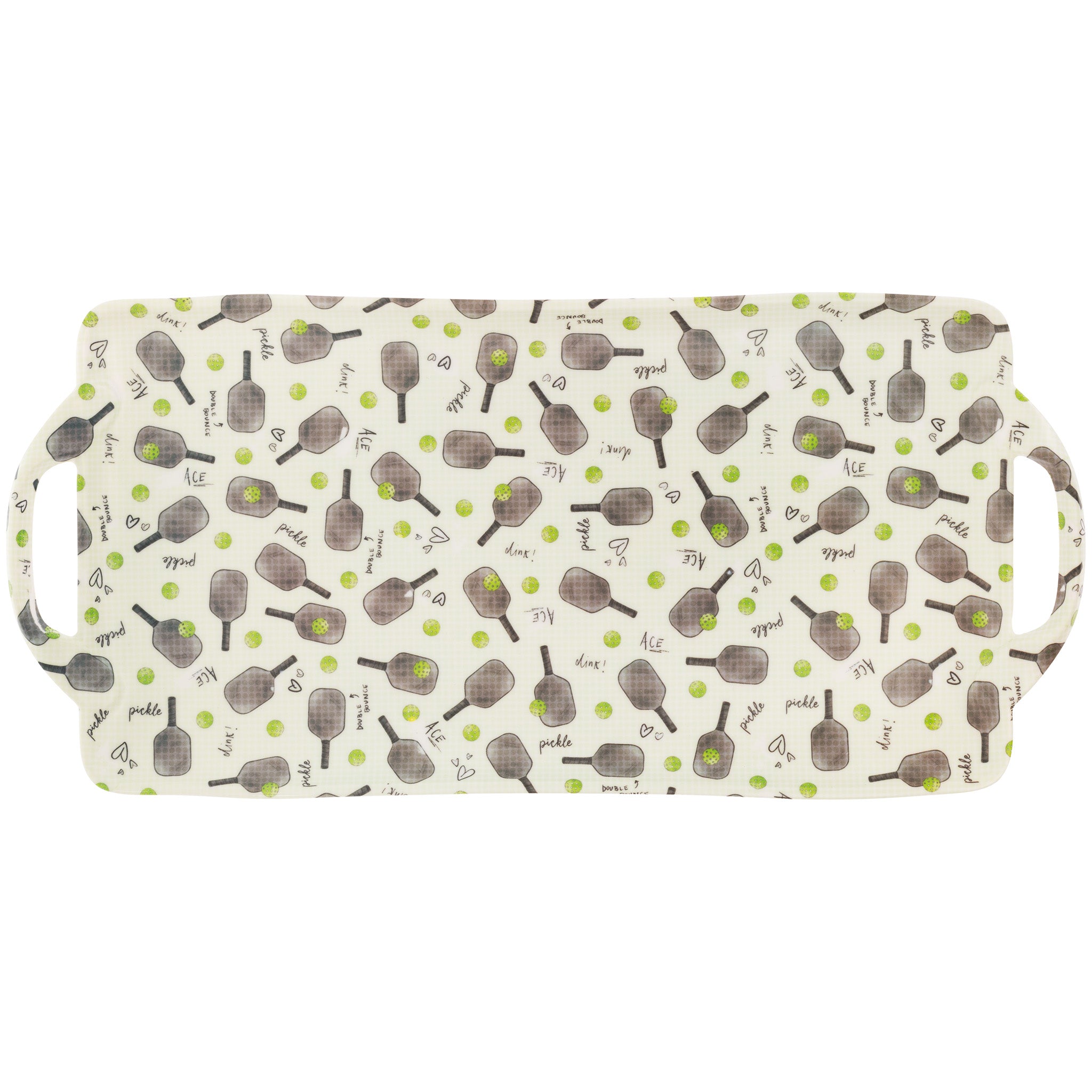 Serve up the fun with this Pickleball Large Melamine Tray, splashed with playful paddles and bright balls that bring courtside energy to any gathering. Crafted from durable, lightweight melamine with easy-grip side handles and a generous surface, it’s perfect for carrying drinks, apps, and post-match treats indoors or out. Approximate dimensions are 18 x 8.75 x .75 inches.
