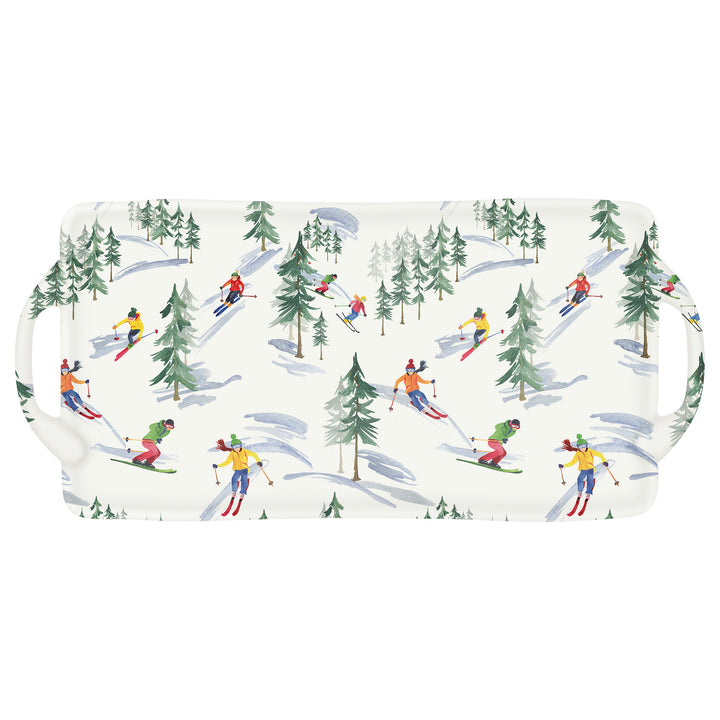 Bring alpine energy to the table with the Down The Slope Melamine Tray Large, its lively skier pattern dancing across a generous serving surface. Crafted of durable, shatter-resistant melamine, this upbeat tray handles everything from coffee service to après‑ski snacks with easy style. Approximate dimensions are 18 x 8.75 x .75 inches.