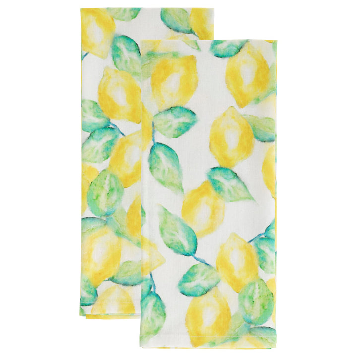 Bring a burst of citrus charm to the kitchen with this set of two cotton tea towels, featuring an artful watercolor print of lemons and leafy greens. Soft, absorbent, and easy to launder, they handle everyday drying and polishing while effortlessly brightening the routine. Approximate dimensions are 28 x 18 x inches.