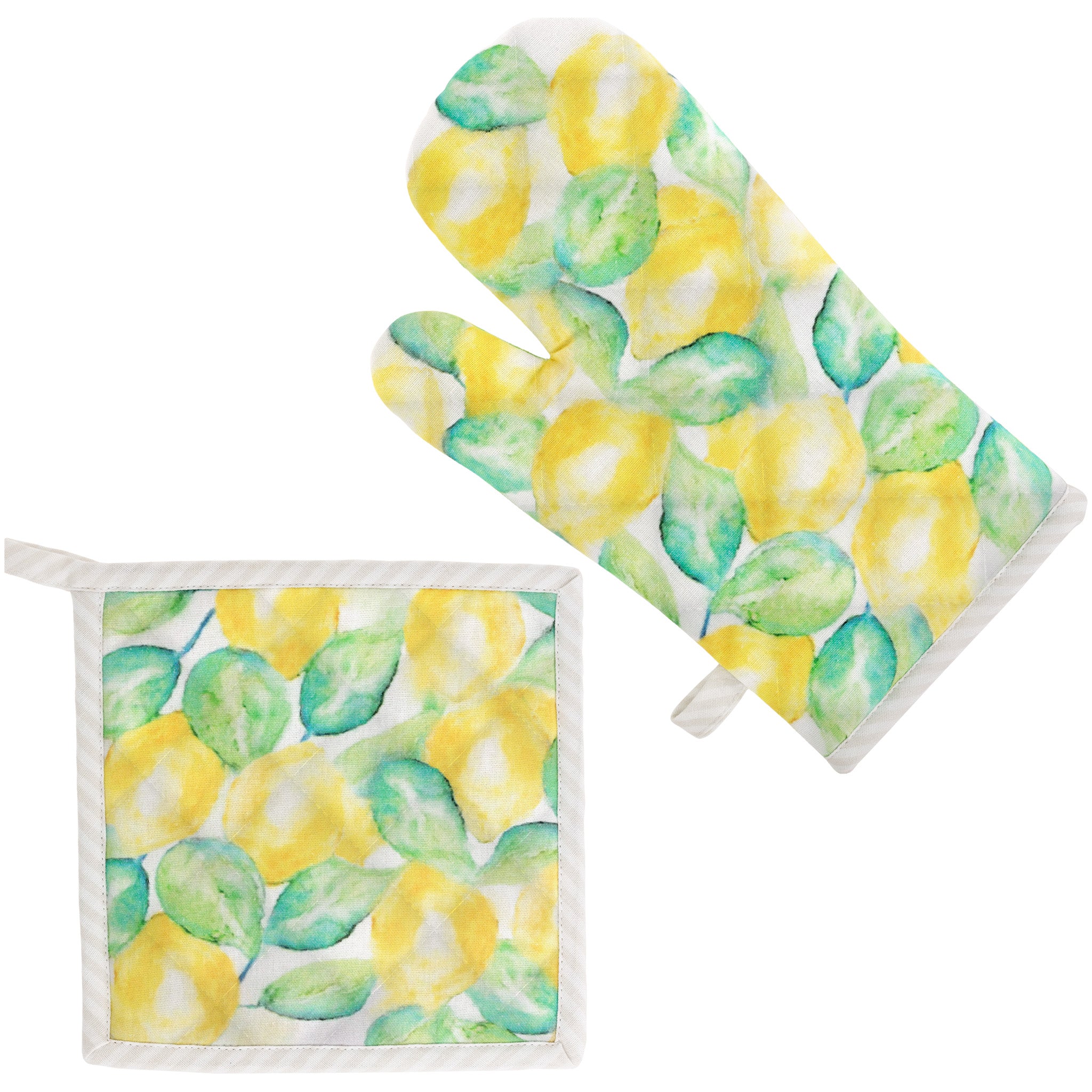 Bring a burst of citrus to everyday cooking with this Lemon Oven Mitt / Pot Holder Set, splashed in painterly lemons and leafy greens. A 100% cotton shell with cushioned 100% polyester fill delivers a comfortable grip and reliable protection as you move hot pans from stovetop to table. Approximate dimensions are 12 x 7 x .75 inches.