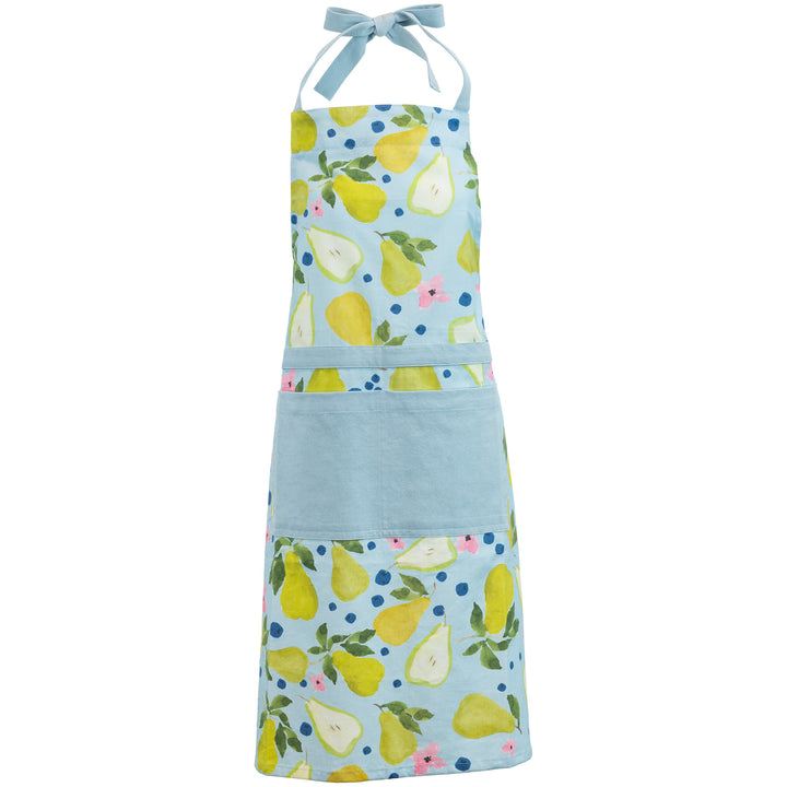 Splashed with watercolor Anjou pears, this cotton apron brings fresh, fruit-forward charm to every kitchen. An adjustable tie neck, long waist ties, and a roomy front pocket make it as practical as it is cheerful for everyday cooking and baking.