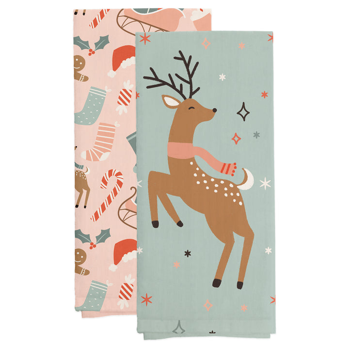 Bring a prance of joy to the sink with this set of two cotton tea towels, showcasing a graceful dancing deer paired with a lively pattern of stockings and sleighs. Soft yet hardworking, these absorbent towels elevate everyday cleanups with cheerful color and lasting durability. Approximate dimensions are 28 x 18 x inches.