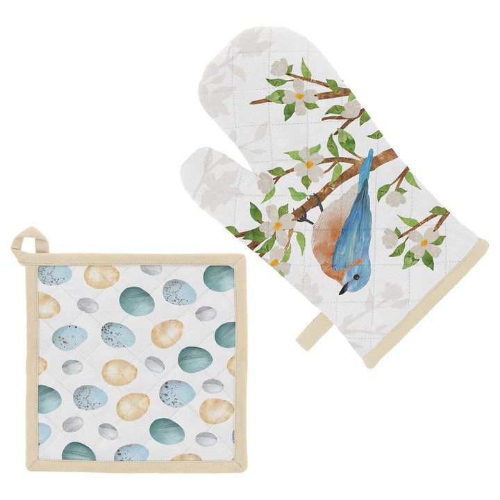 Bring a touch of aviary charm to your kitchen with this cotton oven mitt and pot holder set, showcasing a watercolor bluebird on the mitt and a coordinating scatter of speckled eggs on the holder. Padded cotton with stitched detail provides reliable heat protection, while looped tabs keep the duo within easy reach. Approximate dimensions are 12 x 7 x inches.
