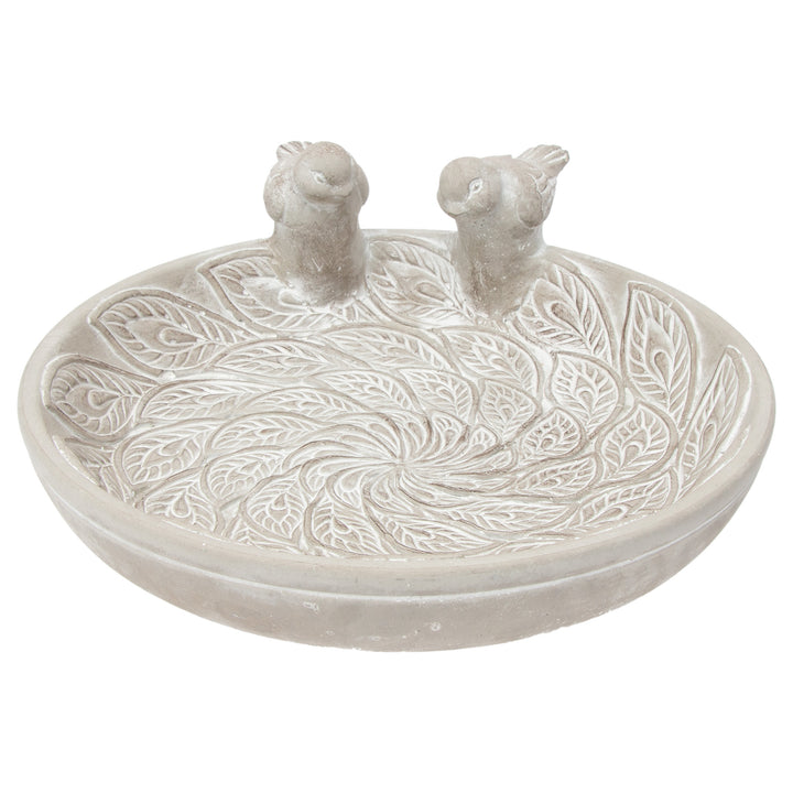 Crafted of weighty cement, this sculptural bird bath features two perched birds and a swirling leaf motif that adds artisan texture to garden beds, patios, or entryways. Durable and stable, it offers a shallow basin that invites small visitors to sip and splash while bringing a quiet, nature-inspired accent to your decor. Approximate dimensions are 9.25 x 9.25 x 3.5 inches.