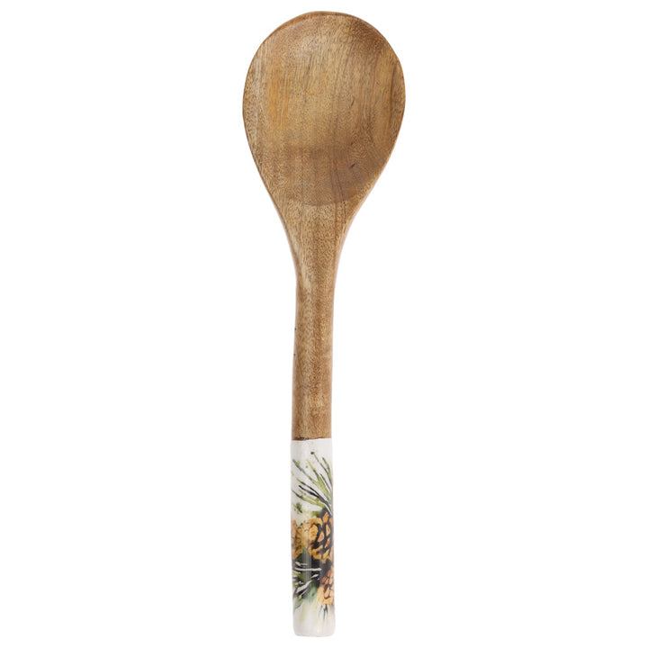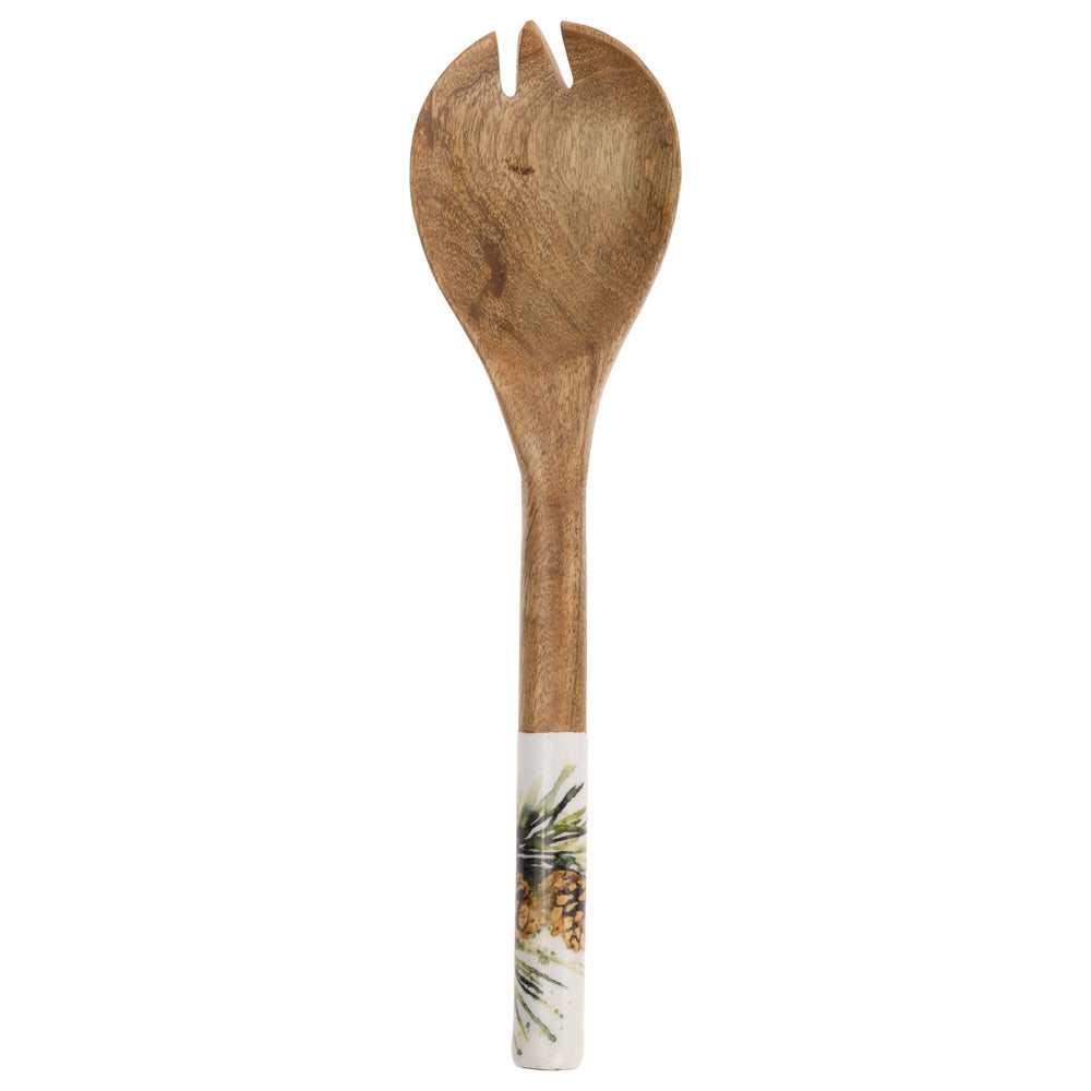 Carved from warm mango wood with enamel-dipped handles, these salad servers showcase a crisp White Spruce motif of pinecones and greenery for a fresh, nature-inspired accent. Finished with a jute rope wrap, the fork-and-spoon duo brings easy style to everyday salads and family-style serving.