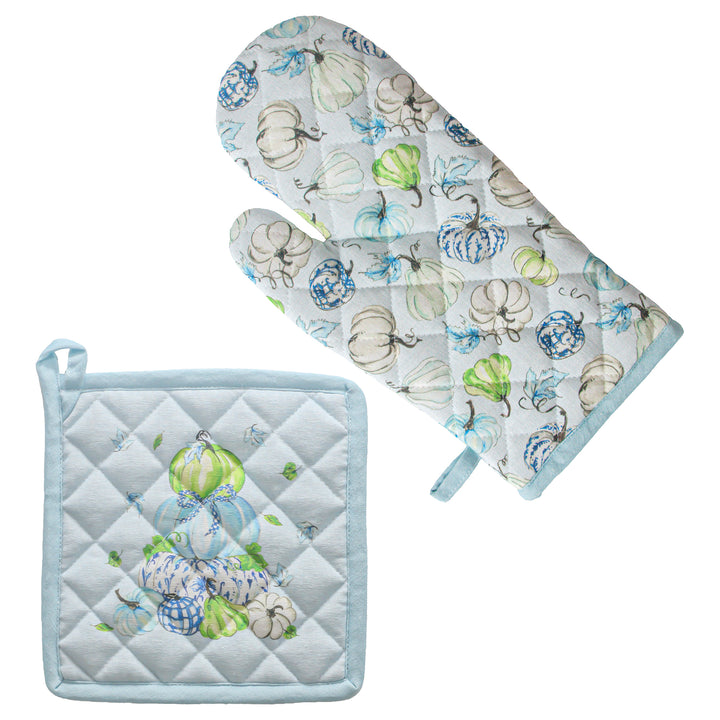 Painterly pumpkins in soothing blues and greens bring chinoiserie charm to the kitchen in this quilted cotton oven mitt and potholder set. Generously padded with neat contrast binding and handy hanging loops, it protects your hands while adding a refined pop of pattern to everyday cooking. Approximate dimensions are 12 x 7 x .75 inches.