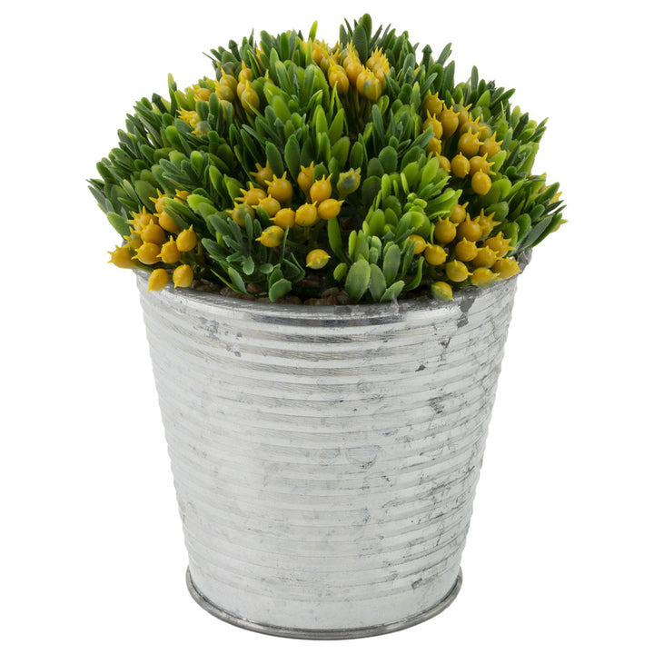 Cheerful yellow buds and lifelike green tips burst from a ribbed, galvanized-style metal can, adding a fresh pop of color to shelves, desks, or small nooks. Crafted of durable plastic and metal, this compact accent delivers the look of a thriving succulent garden with zero watering or mess. Approximate dimensions are 5 x 5 x 6 inches.