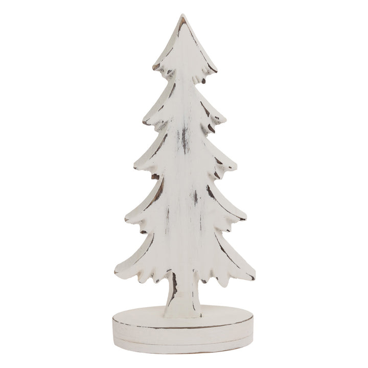 Crafted of firwood with a weathered white finish, this generously scaled tree silhouette brings rustic texture and height to consoles, mantels, or entryways. A sturdy round base and artful distressing make it a versatile stand-alone statement or an easy layer with ceramics, candles, and greenery. Approximate dimensions are 5.5 x 3 x 12.5 inches.