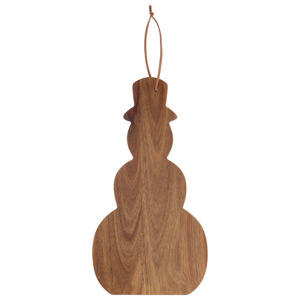 Carved from beautifully grained acacia wood, the Snowman Serving Board brings playful charm to charcuterie, cheese, and dessert spreads while providing a durable, knife-friendly surface. A slim profile and leather hanging loop make it easy to carry, store, and display between gatherings as a warm, wood-toned accent. Approximate dimensions are 12 x 6.25 x .5 inches.