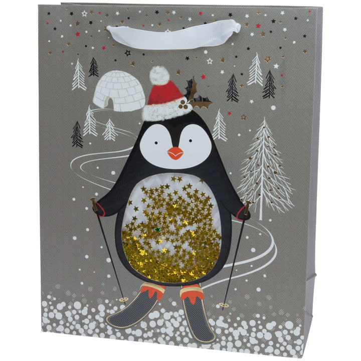 Delight your recipient with a charming penguin on skis and a sequin-filled window that shimmers with every move. Crafted from paper, this large gift bag adds playful sparkle to birthdays, congratulations, and everyday celebrations. Approximate dimensions are 10 x 4 x 12.5 inches.